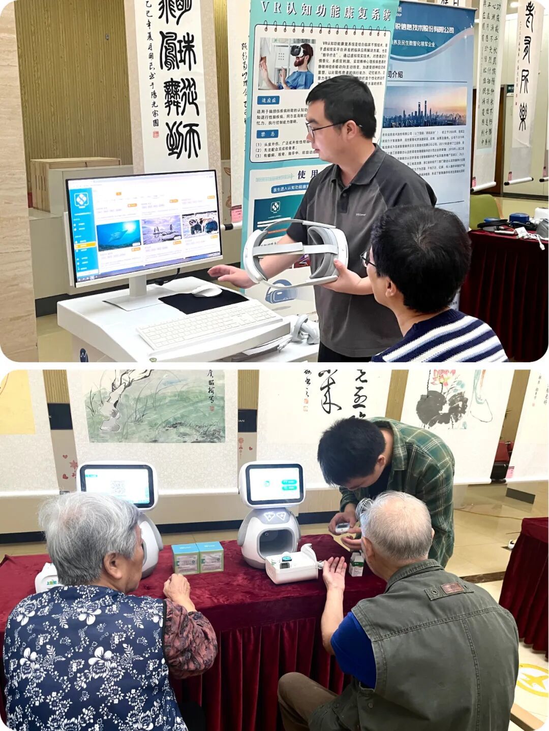 在六号楼的科技互动展区,老爷爷老奶奶们兴致勃勃地体验各种智能设备,玩的很嗨。有的在AI中医诊询台前“搭个脉”,三分钟就能出体检报告;有的戴着4D眼镜,“坐”在船上游西湖。展厅门口,何爷爷专心致志地照护着他的小盆景。院长们一边看,一边赶紧拍下这些新鲜场景。
